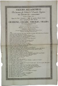 Prova d’esame relativa ad alcuni autori latini: Cicerone, Cesare, Virgilio e Orazio. Vi si legge: «Le domande e i nomi degli studenti si trarranno a sorte». Si tratta di 45 domande cui seguono altre 26. Tra le domande: «Come pubblico Magistrato per quali doti Cicerone si distinse? – In quali scienze ed arti egli era instrutto? – Quali fra gl’ italiani si distinsero per amor ciceroniano? – In cosa consistevano le fortificazioni dei così detti Ceppi, Giglj e Sproni - Quale fu la sorte di Vercingetorige e Alesia? […]».