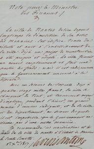 de l’ancien Hôtel des Monnaies de Nantes. Il intervient pour que le gouvernement participe au projet de reconstruction qui offrira du travail à un grand nombre d’ouvriers indigents de la ville. «et édifice tombe de vétusté et nuit à l’embellissement de la ville […] ».