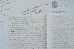 griffe, an 8, sur les habits trouvés à Quiberon), les administrateurs du Morbihan (Vannes, an 3, 2 très intéressantes lettres qu’il faudrait citer en entier, « Il paraît que les Anglais n’ont débarqué que des émigrés et ont porté le nombre à 7000, ils sont campés et retranchés à Carnac, on n’a pas su jusqu’à présent qu’ils ayent tenté d’entreprises […]. Il parait suivant tous les rapports que les Chouans n’ont ni pillé ni égorgé à Auray, on dit même qu’ils en placardèrent l’assurance à la porte de la maison commune, heureuse mais perfide politique […] »), etc. et 3 documents sur le monument de Quiberon (1825, l’un portant une dizaine de signatures).