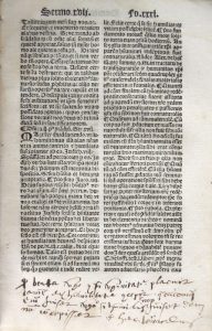 eundem publice declaratum : ac nu[per] Parisius impressum. Paris, Jehan Petit, 1513. In-8, broché, couverture papier gris. 102-(22) ff. Petite tache en marge d’une dizaine de ff. et trace de mouillure dans l’angle interne d’une douzaine de ff. Qq. annotations anciennes et traits de plumes dont deux caviardant le nom d’Olivier Maillard sur le titre et sur le colophon. Impression en caractères gothiques sur deux colonnes à 45 lignes. Grande vignette de l’imprimeur en page de titre (partiellement colorée en jaune), lettrines ornées. Étiquette d’inventaire portant le n° 3 et les initiales C. De M. de R. Sur la contregarde et autre étiquette : 763 bis. Les Sermons d’Olivier Maillard (1430-1502), originaire de Bretagne, prédicateur de Louis XI et du duc de Bourgogne, ont été réimprimés plusieurs fois à Paris pour Jean Petit de 1506 à 1522. Olivier Maillard s'est rendu célèbre par la bizarrerie de ses sermons pleins de bouffonneries, de traits satiriques, d'attaques virulentes et de mauvais goût, de trivialités et de grossièretés empruntées aux mauvais lieux. Ayant un jour lancé des traits mordants contre Louis XI dans un de ses sermons, le roi lui fit dire que, s'il recommençait, il le ferait coudre dans un sac et jeter à la Seine… Larousse XIXe, t. 10, p. 943. Brunet III, 1316 qui précise : dans ce volume le Carême préché à Nantes comptent 102 ff. chiffrés et 2 non chiffrés et l’autre partie 20 ff. chiffrés.
