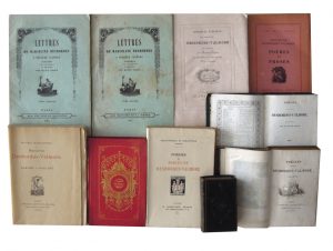 sur les plats, tranches dorées. Qq. frottements, plat du second plat fendu. Tache brune en marge des 60 premiers ff., qq. rousseurs. • Poésies avec une notice par M. Sainte-Beuve. P., Charpentier, 1842. In-12, reliure demi-veau vert, dos lisse orné. viii-383 pp. Qq. rousseurs. Édition originale de ce choix établi par Sainte-Beuve. • Albums à Pauline. Paris, Lemerre, 1921. In-8, broché. Illustrations hors texte en deux états. Tirage à 500 ex. dont celui-ci, un des 25 ex. sur Hollande numérotés et paraphés par l’éditeur. • Lettres à Prosper Valmore publiées avec une préface et des notes par Boyer d’Agen. Paris, Éditions de La Sirène, 1924. 2 volumes in-8, brochés. xxix-(3)-334 et (4)-347 pp. et 2 portraits hors texte. Rousseurs. Ouvrage tiré à 1500 ex. • Romances Inédites recueillies par Bertrand Guégan et décorées de vignettes par Pierre Laprade. Paris, Collection des Parallèles, 1928. In-8, broché, étui. 174 pp. Qq. rousseurs. Ouvrage tiré à 200 ex. sur pur lin de Montval dont celui-ci.80 /