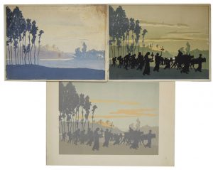 oblong, cartonnage éditeur, plats illustrés, jaquette illustrée.Malgré qq. ff. détachés, belle condition générale. • L’Enfant-Dieu. Recueil de Vieux Noëls des pays de Champagne & de Lorraine restitués et mis en Musique par Georges Fragerolle.Couverture, Garde, Ornementations de Georges Auriol. Paris, Enoch et Co, Flammarion, s. d. (1899). In-4 oblong, cartonnage éditeur, plats illustrés. Coupes légèrement salies. Envoi de Fragerolle sur le faux-titre. Bon état général. • Jeanne d’Arc. Épopée en 15 Tableaux. Poème de G. Fragerolle et Desveaux-Vérité. Dessins de Henri Callot. Paris, Enoch et Co, Flammarion, 1900. In-4 oblong, cartonnage éditeur, plats illustrés, jaquette illustrée. Petite restauration en tête et pied de la jaquette papier. Superbes illustrations à pleine page. Bel état général. Joint une suite d’états (9 planches) : essais de couleur, variantes, une planche annotée et une gouache originale (tachée).