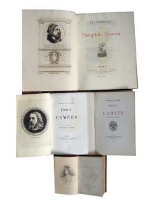 orné, tête dorée. Qq. rousseurs. • Emaux et Camées. Seconde édition augmentée. Paris, Poulet-Malassis et de Broise, 1858. In-12, broché. Frontispice, (2)-230 pp. Qq. rousseurs. • Emaux et Camées. Édition définitive avec une eau-forte par J. Jacquemart. Paris, Charpentier, 1872. In-12, reliure demi-chagrin brun, dos à 5 nerfs, chiffre couronné en pied. Frontispice, (4)-228 pp. Qq. rousseurs. Bel ex-libris armorié : Bibliothèque de Mouchy. • Collectif. Le Tombeau de Théophile Gautier. P, Lemerre, 1873. In-4, reliure (signée Marmin) demi-maroquin brun à coins, tête dorée. Cuir un peu taché, coins émoussés. Frontispice, (4)-179-(1) pp. Rares rousseurs. Edition originale de ce recueil de poèmes en hommage à Théophile Gautier mort le 23 octobre 1872, écrits par plus de 80 auteurs parmi lesquels Hugo, Mallarmé, Hérédia, Leconte de Lisle, Mistral…100 / 15