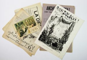 I nomi sono i seguenti: Incudine. Foglio di battaglia della gioventù operaia e contadina. Maggio 1925; L’amico del popolo. Organo dei socialisti anarchici. Milano, 10 aprile 1892; Il pungolo toscano. Giornale politico, amministrativo di scienze ed arti. 19 gennaio 1897; La difesa. Periodico popolare di politica, sociologia e arte. Firenze, 9 ottobre 1898; Il bruscolo. Giornale politico settimanale del popolo. Firenze, 3 marzo 1901; La Battaglia elettorale. Organo del comitato pro Giuseppe Levis unico candidato costituzionale eleggibile. Non datato; Mutina- Mutina. Giornale a profitto della Cucina popolare dal convegno degli artisti modenesi. Numero unico. 8 febbraio 1880; La Fronda. Firenze, 18 gennaio 1880; Anche Bologna! Albo unico del circolo artistico. Zanichelli, 1880 (2 esemplari); Album del Cri-Kri. Febbraio 1888 (n. 8). Con alcune illustrazioni e pubblicità.