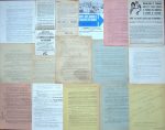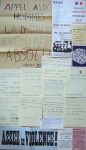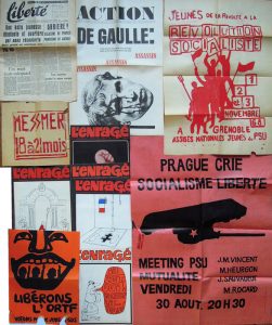 tendances, années 1968-1969 : Comités étudiants, UNEF, Fédération des Etudiants Révolutionnaires, Syndicats, Comité d’agitation culturelle, Comité d’action pour la Ve République, UDR, PSU, ORA, Comité Havrais d’action publique, journal Action (n° 7 du 11 juin et n° 10 du 14 juin), L’enragé (n° 1, 3 à 8, 11, édités par J. J. Pauvert) … Nombreux prospectus distribués en mai 1968 (datés du jour) dont l’un signé Antonin Artaud (?)… qq. documents sur les évènements de Prague, le référendum d’avril 1969… Marques de semelles et traces de scotch sur plusieurs documents. Joint qq. documents et une affiche ORTF La police vous parle tous les soirs 20 h. (reprint 1988) du 20e anniversaire.100 /