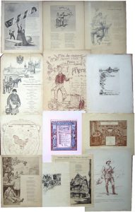 menu du 30 mai 1902; Dagorno, Marché de La Villette, menu illustré par Edouard Bernard; Le Fiacre décoré par Zig; Le vieux Montmartre, banquet du 28 mars 1896; Diner du Bon-Bock entre 1888 et 1898 (5 menus illustrés par Willette, Hubert-Robert, Pille, Brispot, Kauffmann)