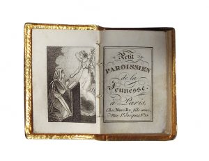 Rousseurs, déchirure sur le dernier f. en partie collé à la contregarde. • Petit Paroissien de la Jeunesse. Paris, Marcilly, s. d. Minuscule 4,3 x 2,8 cm, reliure papier doré à décor en relief au dos et sur le premier plat, titre en relief sur le second plat, tranches dorées. (2)-94 pp. et 5 figures hors texte. Bel état.