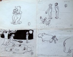 inachevées ou légendes seules; 1 esquisse au crayon; 12 dessins à l’encre. Plusieurs ff. de notes dactylographiés ou manuscrits comportant la liste des dessins et les répartitions pour les Lettres Françaises ou autres revues ou albums. Le cachet Jean Eiffel confectionné pour la vente a été apposé sur tous les dessins.300 / 4