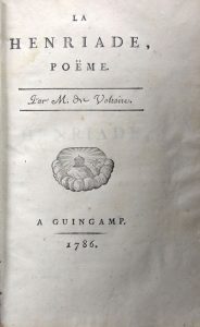 [GUINGAMP]. VOLTAIRE. La Henriade, poëme. A Guingamp, s. n., 1786. In-8, reliure d’attente, papier rose. Couverture frottée, dos passé. 420 pp. Trace de mouillure dans l’ange supérieur interne. Ex-libris : Prince ...
