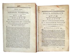 reliure basane marbrée, dos à nerfs orné. Épidermures, mors en partie fendus, galerie de vers sur le second plat, manque en tête du dos, coins usés. 764 pp. Galerie de vers en marge intérieur sur les 30 premières pages, sinon bon état intérieur. Complet du n° 1 du 12 mai 1789 au n° 93 du 30 décembre 1789. Exemplaire de l’avocat Gillart père dont le nom figure sur plusieurs livraisons. 1790 : In-8, reliure basane marbrée, dos à nerfs orné. Épidermures, mors en partie fendus, galerie de vers sur le premier plat. Manque le Bulletin n° 35 (p. 275 à 282). Intérieur en bon état.150 /
