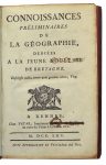 légers frottements, coins émoussés. (2)-xiv (i. e. x)-142 pp. En tête du texte figure le titre suivant plus explicite : Mémoire ou Canevas d’un Projet proposable aux Etats de Bretagne pour le payement de la Corvée. Ouvrage peu courant, absent de Sacher. On joint : LOAISEL de TRÉOGATE. Dolbreuse ou l’Homme du siècle, ramené à la Vérité par le Sentiment & par la Raison. Histoire philosophique. Paris, Belin, 1788. 2 tomes en un volume in-8, reliure de l’époque beau brun dos à nerfs orné. Plats détachés, frottements, ors estompés. viii-120-128 pp. Manque les frontispices. Papier roussi. • [DUBOURG LE VAL (Julien)]. Connoissances Préliminaires de la Géographie, dédiées à la jeune noblesse de Bretagne. Vannes, Vatar, 1765. In-8, reliure de l’époque basane marbrée, dos à 5 nerfs orné. (28)-232-(12) pp. Tache brune dans l’angle inférieur de 3 ff. Les mots Noblesse, Roi et Parlement en page de titre ont été caviardés, qq. annotations et corrections à l’encre brune. Édition originale. Sacher p. 60.150 / 2
