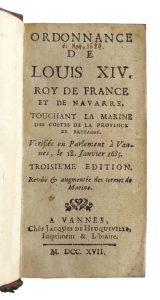 [DROIT - Marine]. Ordonnance de Louis XIV… touchant la Marine des Costes de la Province de Bretagne. 3 e édition revue et augmentée des termes de Marine. Vannes, Jacques de Heuqueville, 1717. In-32, ...