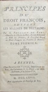 [DROIT]. POULLAIN DU PARC (Auguste Marie). • Principes du Droit Français suivant les Maximes de Bretagne. Rennes, Vatar, 1767-1771. 12 volumes in-12, reliure basane marbrée, dos lisse orné. ...