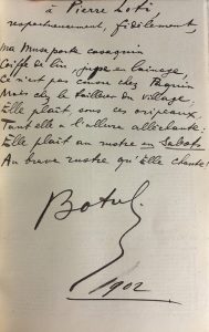 Paris, Ondet, 1902. In-8, reliure (signée Mériot à Rochefort) demi-veau brun à coins, dos et mors orné de feuillages dorés, pièce de titre maroquin émeraude, tête dorée, gardes imprimées d’un semis de violettes. Couvertures illustrées conservées. Frontispice, 286 pp. Exemplaire un peu court en tête.Mention de 2e mille. Bel envoi avec un poème (inédit ?) de Botrel signé et daté 1902 à Pierre Loti : à Pierre Loti, respectueusement, fidèlement, / Ma muse porte casaquin, / Coiffe de lin, jupe en lainage, / Ce n’est pas cousu chez Paquin /Mais chez le tailleur du village; / Elle plait sous ces oripeaux, /Tant elle a l’allure alléchante : / Elle plait au rustre en sabots / Au brave rustre qu’elle chante ! • Jean Kermor. Comédie dramatique en 3 actes. Niort, Boulord, s. d. In-12, broché. Signature autographe sur le faux-titre.90 /