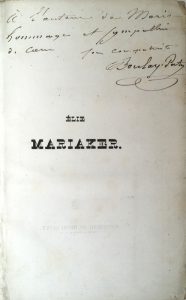 frottés. Couverture conservée (petites déchirures marginales, second plat doublé). Frontispice, (4)-civ-247 pp. Rares rousseurs. Non rogné. Édition originale ornée d’un frontispice gravé à l’eau-forte par Boisselat sur Chine monté, enrichie d’un envoi de l’auteur à Auguste Brizeux sur le faux-titre : à l’auteur de Marie hommage et sympathie de cœur son compatriote Boulay-Paty. • L’Héroïsme de Bisson, Ode dédiée à la Marine Française. Paris, Ladvocat et Ponthieu, 1828. In-8, reliure à la Bradel, titre en long au dos. 12 pp. On joint : MENARD (Ernest). L’Amiral de Bretagne. Roman inédit. Paris, Coquebert, 1842. 2 volumes in-8, reliure de l’époque demi-maroquin vert, dos lisse orné. (6)-335 pp. et (4)-340 pp. Qq. rousseurs. Édition originale. Sacher p. 145.