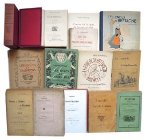 Au Fil de la Route Bretonne (Paysages, Tpyes, Mœurs et Légendes). Paris, Nilsson, s. d. In-8, broché. Dos cassé. 316 pp. Manque cahier 14. • CHASSÉ (Charles). Les Contes de la Lande en Fleur. Dessins de J. Ovens. Paris, Horizons de France, s. d. (1944) In-8, broché. Couverture illustrée. 122-(3) pp. Papier jauni. • COLLECTIF. Contes et Nouvelles Bretonnes. Rennes, Blin, 1836. In-8, reliure demi-basane rouge, dos à 4 nerfs orné. (4)-318-(1) pp. Qq. rousseurs.. Textes de Vicomte de Marquessac, Carlos Nariz … plusieurs non signés. • DENIS (H.). Légendes de Bretagne. Illustrations de Lassauvajue. Paris, Lanore, s. d. (1942) In-8, cartonnage éditeur, dos toile bleue. Couverture illustrée. 158 pp. Illustrations en noir dans le texte et à pleine page. • FOUQUET (Alfred). Légendes, Contes et Chansons Populaires du Morbihan. Vannes, Cauderan, 1857. In-12, broché. Dos cassé, débroché. 180-(8) pp. • LE PICAUT (Louis). Entre deux Cidres. Contes du Pays de Vannes. Illustrations de Th. Busnel. Rennes, Caillière, 1900. In-8, broché. Couverture illustrée. 28 pp. Rares rousseurs. • LUZEL (F. M.). Contes Populaires de Basse-Bretagne. Paris, Maisonneuve et Leclerc, 1887. 3 volumes in-12, cartonnage éditeur percalien rouge, titre doré au dos (ors oxydés). xx-452-(3)-434-(1)-480-(3) pp. Brochages lâches, qq. ff. détachés. Tomes 24, 25 et 26 de la collection Les littératures populaires de toutes les Nations. Complet en trois volumes. • VILLIERS (Alexandre de). Légendes du Pays de Carnac. Vannes, Lafolye, 1897. In-12, broché. Couverture défraîchie. 361-(2) pp. Papier jauni. • [TAYA (Baron du)]. Le Roi Audren - Monseigneur Saint Yves. Légendes. Rennes, Vatar, 1841. In-8, broché. Couverture défraîchie, détachée. (4)-77-(3)-11 pp. Qq. rousseurs. Fascicule IV et V des Opuscules Bretons.