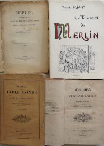 couverture. 31 pp. Qq. rousseurs. Extrait de la Revue des Provinces de l’Ouest. • HERSART de La VILLEMARQUÉ (Vicomte). Myrdhinn ou l’Enchanteur Merlin. Son histoire, ses œuvres, son influence. Paris, Didier, 1862. In-8, reliure demi-percaline grenat, chiffre A. M. en pied. (4)-xi-435 pp. Qq. rousseurs. • HERSART de La VILLEMARQUÉ (Vicomte). Les Romans de la Table Ronde et les Contes des anciens Bretons. Nouvelle édition. Paris, Didier, 1861. In-8, broché. Couv. un peu défraîchie (déchirures marginales). (4)-xxvi-(2)-448 pp. Qq. rousseurs. Catalogue de l’éditeur in fine (28 pp.). Edition originale. Sacher p. 112. • BRIANT (Théophile). Le Testament de Merlin. 2e édition enrichie de nombreux documents. Nantes, Bellanger, 1975. Grand in-8, broché. xxxiii-(7)-266 pp. et 107 illustrations in fine. Ex-libris manuscrit en page de titre : P. -A. Rétho. 90 /