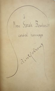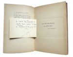 date 1893 en pied, pièce de titre chagrin brun. Petite fente en tête du mors du second plat, coiffes légèrement frottées. (4)-frontispice-(10)-230 pp. Petite correction manuscrite p. 121. Edition originale accompagnée d’un bel envoi signé de Saint-Pol-Roux à Sarah Bernhardt en page de garde et d’une carte de visite manuscrite insérée entre les pages 40 et 41 : « avec prière, Madame, d’agréer la dédicace de la légende Le Pèlerinage de Sainte-Anne, poème en prose rhytmée (sic) à dire, page 41 Sprx ». Exemplaire ayant figuré sous le n° 46 de la première vente Sarah Bernhardt, 25 et 27 juin 1923.300 /