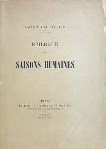 composée par Franc Aché sur les machines Alauzet. Rare édition originale imprimée à compte d’auteur, sur papier d’édition. • Épilogue des Saisons Humaines. Paris, Mercure de France, 1893. In-8, broché. Dos en partie cassé, qq. petites déchirures marginales en couverture. (4)- 81 pp. Bon état intérieur. Rare édition originale (pas de grand papier annoncé). 200 /