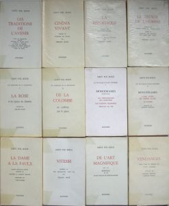 Saint-Pol-Roux par Gérard Macé. 1970. E. O. Un des 150 ex. numérotés sur Alfa Mousse Navarre. • La Répoétique. Préface de Raymond Datheil suivie de Le poème du monde nouveau par Gérard Macé. 1972. E. O. Un des 125 ex. numérotés sur alfa mousse Navarre. • Cinéma vivant précédé de l’Empire du soleil par G. Macé. 1972. E. O. Un des 150 ex. numérotés sur alfa mousse Navarre. • Vitesse. Texte établi et annoté par Gérard Macé. 1973. E. O. Un des 150 ex. num. sur Alfa Mousse Navarre. • Les Traditions de l’avenir. Textes présentés par G. Macé. 1974. E. O. Un des 150 ex. numérotés sur offset afnor 7. • De l’Art magnifique suivi de Réponses… Texte établi par Gérard Macé. 1978. Un des 150 ex. numérotés sur Bouffant afnor 7. • La Dame à la faulx. Version inédite précédée de Lettres à Jacques Rouché présentées par Yves Sandre. 1979. Un des 150 ex. numérotés sur Alfa-Mousse. • Les Reposoirs de la procession I et II. Préface de Gérard Macé. 2 volumes sur bouffant. • Le Tragique dans l’homme I et II. Monodrames. Postface de Jacques Goorma. 1983-1984. 2 vol. sur bouffant. • Vendanges. Texte établi et présenté par Yves Sandre. 1993. Ex. sur offset.