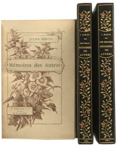 fleurs rouges, têtes dorées. Couvertures conservées sur les 3 volumes. • Mémoires des Autres. Illustrations de Noël Saunier … Paris, Testard, 1890. Tirage à 80 ex. Numérotés (50 Japon et 30 Chine). Celui-ci sur papier de Chine, portant l’inscription : n° 1 pour MM. Marpon et Flammarion. • Nouveaux Mémoires des Autres. Illustrations de Léandre. Paris, Testard, 1891. Tirage de luxe à 50 ex. numérotés, dont celui-ci un des 25 ex. sur papier de Chine. • Les Derniers Mémoires des Autres. Illustrations de Lœwitz. Paris, Flammarion, s. d. (1891). Tirage à 20 ex. sur papier de Chine numérotés et paraphés par l’éditeur dont celui-ci.