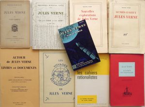 Le très curieux Jules Verne. Nouvelles Explorations de Jules Verne. NRF, 1960 et 1963. 2 volumes in-8, brochés. • CHARDON (Pierre). Les Voyages extraordinaires de Jules Verne. Paris, Gonon, 1964. In-8, broché. 24 pp. et 4 pl. hors texte. Plaquette inédite à tirage limité pour les souscripteurs des Voyages extraordinaires illustrés par les peintres. • EXPOSITION. Jules Verne hier et demain. Exposition du 25 mars au 30 avril 1966. Renault Elysées. Paris, Le livre de poche, 1966. In-12, broché. Couv. illustrée. Rare catalogue d’exposition présentée dans le hall de la Régie Renault. Pliure sur 3 ff. Illustrations pleine page. • EXPOSITION. Jules Verne. De la terre à la lune a cent ans. Bibliothèque Municipale de Nantes. 15 avril - 15 mai 1966. Nantes, Chiffoleau, 1966. In-8, broché. Couverture illustrée. Portrait et planche hors texte.80 /