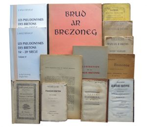Vannes, J. M. Galles, s. d. In-12, papier dominoté. Dos manquant. 215 pp. Rousseurs. • BREURIEZ AR FEIZ (Société Armoricaine). Nouvelle Grammaire bretonne, d’après la méthode de le Gonidec, Suivie d’une Prosodie. Saint-Brieuc, L. Prud’homme, 1847. In-12, reliure demi vélin. Coins émoussés. viij-63-(1) pp. Qq. rousseurs. • MALO RENAULT (J.). Les Pseudonymes des Bretons 16e - 20e siècle. Brest, Ar Skol Vrezoneg, 1994. 2 volumes in-8, brochés. Pagination continue : 297 pp. Bon état. 100 /