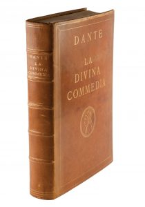 In-folio (mm 400x290). Pagine [2], XI, [1], 524, [2]. Marca tipografica al frontespizio, ripetuta in fine in rosso e moltissimi capilettera e illustrazioni nel testo. Esemplare n. 20 su una tiratura complessiva di 306 copie, uno dei 300 su carta a mano filigranata della ditta Miliani di Fabriano. Legatura in pieno vitello nocciola con due cornici concentriche di semplice filetto impresse in oro ai piatti, medaglione con ritratto di Dante e titoli dorati al centro, ripetuti al dorso a 5 nervi. Tagli dorati e unghiature con dentelles impresse in oro. Edizione della Commedia con il commento di Giuseppe Lando Passerini e dedica di Gabriele D'Annunzio a Vittorio Emanuele III, nella quale sono riprodotte le 100 xilografie dell'incunabolo stampato a Venezia nel 1491 da Bernardino Benali e Matteo Capocasa da Parma.