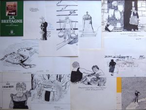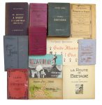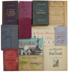 une carte du chemin de fer de l’Ouest. • JOANNE (Adolphe). France Bretagne. 2e éd. Hachette, 1873. In-8, cartonnage éditeur. Avec 10 cartes et 7 plans. • Guide Conty. Bretagne Ouest. Iles Anglaises. Guide circulaire. 2 ex. in-12, cartonnage éditeur. L’un avec la carte dépliante, l’autre sans. • Chemins de Fer de l’Ouest. Voyages à Prix réduit. Imp. Moreau. In-8 oblong, broché. Couv. illustrée par Fraipont. Trsè bon état. • DERVENN (Claude). La Route de Bretagne. Dinan, Beaudré. In-8, broché. Illustrations en noir et bleu. Bel état. On joint : LE LIBOUX (Yann-Lukas). La Bretagne. Guides Flammarion. Série de 23 dessins originaux pour illustrer le guide Flammarion La Bretagne paru en 1979. Sont joints 7 dessins reproduits en photocopie avec des annotations. Les dessins n’ont finalement pas été retenus.