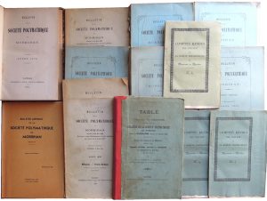 cassés.Années 1872-73-74 reliées en un volume, de 1875 à 1949, volumes brochés : manquent les années 1877, 1878, 1902 à 1905, 1941, 1943 À 1945, 1947. On joint un volume contenant la Table des Travaux et mémoires depuis 1826 jusqu’à 1926 et 3 fascicules brochés : Comptes rendus n° 4, 5 et 6 des Travaux de la Société (Vannes, Galles, 1832).