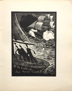 In-4, broché. Couverture illustrée. Non paginée. Bois gravés dans le texte et à pleine page. Envoi de Savin et Léonnec à André Salmon. • POSTOLLEC (Jean Louis) et LAPIPE (Jean), Quartiers maîtres à bord de la Scabreuse. Chansons de Bord. Paris, Productions de la Seine, 1970. In-4, en feuillets sous porftolio à rabats. Premier plat illustré (légères oxydations). Recueil de 12 Chansons pour les Dames et 12 Chansons pour les Hommes, chacune sur double feuillet illustrés avec la musique notée. 80 / 1