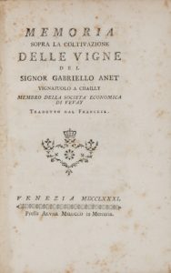 Anet Gabriello, Memoria sopra la coltivazione delle vigne [...] tradotto dal francese. Venezia: presso Alvise Milocco, 1781.