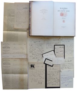 demi-maroquin bleu nuit à coins, dos à 5 nerfs orné, tête dorée. Couvertures et dos conservés. (12)- 133-(2) pp. et 4 planches hors texte. Qq. rousseurs assez diffuses. Illustrations dans le texte, ornements en sépia. Tirage unique à 220 ex. numérotés dont celui-ci, imprimé pour Fernand Crouan. On joint un ensemble de documents relatifs à la publication de l’ouvrage : des épreuves des premières pages (1 à 9) du texte de Lepère, trois lettres des papeteries d’Arches Perrigot-Masure (deux à Lotz Brissonneau et une à Lepère) à propos de la fourniture du papier pour l’ouvrage, un brouillon de texte pour la souscription, des lettres de libraires (Floury, Sagot…) et de souscripteurs, une petite enveloppe avec une dizaine de cartes de visite des souscripteurs de l’ouvrage.300 / 4
