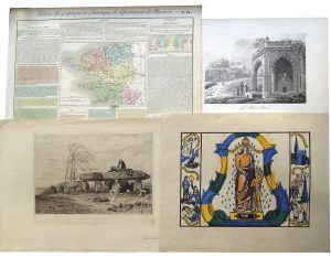 VAUZELLE et divers. Réunion de cartes et estampes dont : • VAUZELLE. Les Pelerins Bretons. Lithographie. 27 x 37 cm. • GAUCHEREL (Léon). Locmariaker. Éd. Cadart et Chevalier. Eau-forte. 35 x ...