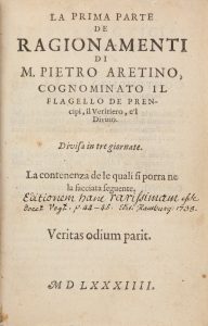 3 parti in 1 volume in-8° piccolo (mm 145x90). Pagine [10], 968 [i.e. 198]; 2 bianche,  [6], 339, [1]; 118, 2 bianche. Strappi nel testo in una decina di carte sparse, magistralmente riparati e senza perdite, per il resto ottimo esemplare. Splendida legatura coeva in pelle di scrofa montata su assi di legno con ai piatti cornici concentriche di triplici filetti a racchiudere una bordura di fregi floreali e zoomorfi, piccoli ferri floreali accantonati interni, ripetuti al centro con andamento circolare; titoli manoscritti al dorso, tagli blu e fermagli perfettamente conservati. Ex-libris Bibliotheca Teodori Karajan (noto germanista austriaco del XIX secolo) applicato al contropiatto, dove vi è pure una nota di possesso manoscritta, altro ex-libris Giorgio Fanan, annotazione manoscritta di settecentesca mano al frontespizio. Bell'esemplare, in splendida legatura in pelle di scrofa di questo classico della letteratura erotica, dove ai ragionamenti licenziosi è unito il Dialogo di Zoppino e il commento di Annibal Caro a La ficheide di Francesco Maria Molza. Terza delle quattro edizioni dei Ragionamenti stampate sul finire del Cinquecento, tutte con la data del 1584 e con il falso luogo di stampa di Bengodi in varie forme di sottoscrizione. Estremamente rara, al pari delle altre tre. Il nostro esemplare è conforme a quello descritto in Choix 2875 e in Graesse II, 190 sotto la lettera α, classificato da Gamba 1201 come seconda tiratura e da Brunet I, 411 come terza; Casi 160, in un recente studio sull'Aretino, ipotizza invece che questa nostra edizione sia stata stampata intorno al 1600 ca., forse ad Amsterdam. Tuttavia, come per la data, non vi è concordia fra gli studiosi neanche  sul reale luogo di edizione; alcuni indicano Parigi, altri Londra, Venezia, Amsterdam ecc. Dopo le prime due parti dei Ragionamenti segue una terza parte rappresentata dal Commento di Ser Agretso da Ficaruolo sopra la prima ficata del padre Siceo. Con la diceria de nasi. Cfr. Parenti 35: «L'errore Agretso per Agresto, consente di distinguere questa edizione da una contraffazione fatta nel 1649, la quale ha, peraltro, in fine della seconda parte, la sottoscrizione: MeDICata reLabor [non presente nel nostro esemplare, N.d.R], che comprende il cronogramma rivelatore della vera data di stampa». Si vedano anche Adams A-1581, Gay-Lemonnier III, 26-28; Pia II, 1135-1136.