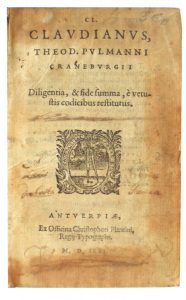 Première édition plantinienne des uvres du poète latin Claudien, (v. 370 - v. 404) établie par l humaniste Theodore Pulmann.