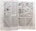 Tout le texte est imprimé en rouge et noir, présenté selon une architecture complexe accompagnée de gloses et agrémenté de lettrines historiées et de vignettes.