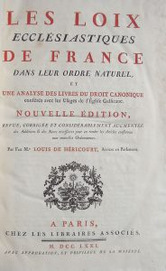• LES LOIX ECCLÉSIASTIQUES DE FRANCE dans leur ordre naturel et une analyse des livres du droit canonique conférés avec les Usages de l’Eglise galllicane.