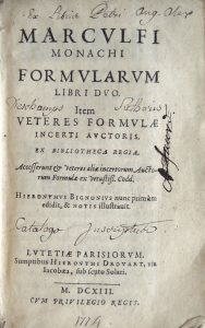 MARCULF. MARCULFI MONACHI FORMULARUM LIBRI DUO; item veteres formulæ incerti auctoris, ex bibliotheca regia; accesserunt & veteres aliæ incertorum auctorum formulæ : ex. vetustiss. codd. Jieron. Bignonius edidit & notis illustravit. Lutetiæ...