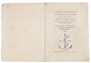 Athenagoras, Della risurrettione de' morti, tradotto in lingua italiana da Girolamo Faleti: Con una oratione della natività di Christo. In Venetia: [Paolo Manuzio], 1556.