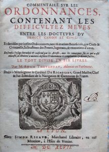 THEVENEAU (Adam). COMMENTAIRE SUR LES ORDONNANCES, contenant les difficultés meües entre les docteurs du droit canon et civil… le tout divisé en six livres. Lyon, Rigaud, 1647. In-4, reliure de l’époque veau marbré, dos à 5 nerfs orné,...
