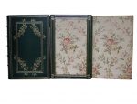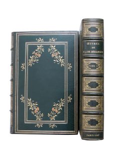 2 volumes in-8, reliure (signée Wendling) maroquin vert, dos à 5 nerfs orné, décor mosaïqué de branchages fleuris sur les plats dans des encadrements de filets dorés, tête dorée, gardes de soie brodés, doubles gardes de papier doré orné d’un décor géométrique, étui bordé.