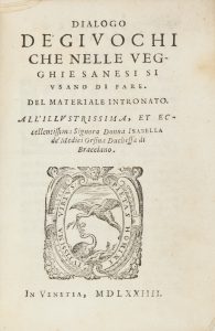 Bargagli Girolamo, Dialogo de' giuochi che nelle vegghie sanesi si usano di fare. In Venetia, 1574 (Al colophon:) In Venetia: Appresso Gio. Antonio Bertano, 1574.