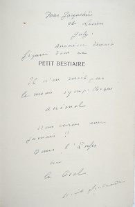 [LAURENCIN]. JOUHANDEAU (Marcel). PETIT BESTIAIRE Avec huit eaux-fortes en couleurs par Marie Laurencin. Paris, NRF, 1944. In-8, en feuillets, sous chemise et étui de l’éditeur papier rose, étiquette imprimée (dos un peu passé, une petite...