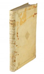 In-4° (mm 212x155). Pagine [18], 184 con 4 tavole xilografiche ripiegate fuori testo con raffigurazioni di armature e schemi di campi di battaglia. Antiporta incisa in legno, piccola vignetta xilografica al frontespizio, capilettera alle pagine, anch’essi in xilografia. Un piccolo foro restaurato all’antiporta, un lavorio di tarlo marginale restaurato alla carta del frontespizio, alcune integrazioni a stampa alle carte G e G2, ma nel complesso buono lo stato di conservazione di carte e tavole. Legatura rimontata in piena pergamena con titoli manoscritti al dorso, cornice a motivi fitomorfi e losanga centrale impressa in oro ad entrambi i piatti. Sguardie in carta marmorizzata, tagli spruzzati. Macchie d’unto al piatto anteriore. Nota di possesso manoscritta firmata Capponi ed ex-libris al contropiatto anteriore. -