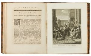 In-4° (mm 275x220). Pagine VIII, 330, [2] (Avis au relieur) + 31 splendide tavole con le figure incise in rame fuori testo. Frontespizio in inchiostro rosso e nero con graziosa vignetta incisa in rame, testatina calcografica, iniziali e ornamenti tipografici al testo incisi in legno. Usuali lievi fioriture sparse ma bell'esemplare, con le tavole avant les numéros, in fresca e nitida tiratura. Legatura coeva in pieno vitello nocciola con titoli dorati su tassello applicato al dorso e ricche decorazioni ai comparti, leggermente allentata e con piccoli forellini di tarlo al dorso. Edizione ricercata, specie con le tavole in prima tiratura come nell'esemplare proposto; Cohen-Ricci 216: «Superbes illustrations; livre très recherché [...]. Les premières épreuves des figures se reconnaissent à ce qu'il n'y a pas de numéros au-dessous de la légende des figures»; Choix 18419; Palau III, 426. Le incisioni sono state incise in maggior parte da Bernard Picart e Schley, ma anche da Fokke, Trémolièrer e Tanjé su disegni di Charles Coypel, Le Bas e Cochin; le due vignette sono state disegnate e incise da Schley.