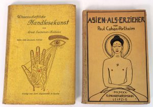 "ESOTERISME ALLEMAND" COHEN-PORTHEIM "Asien-Als-Erzieher", Leipzig, 1920, relié toile, 1er plat illustré ( avec une Svastika)+ ISSBERNER-HANDLESEKUNST", Berlin 1925, relié toile illustré