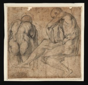 Études de deux hommes nus, l’un vu de dos et semblant se baigner, l’autre assis et de profil, tourné vers la gauche. Pierre noire (deux manques en haut). Avec un paraphe ‘JB’ (?) à la plume et encre brune, en bas vers la gauche (pas dans Lugt). 12,5 x 12,8 cm. Ce dessin peut être rapproché de deux figures du Baptême du Christ, une huile sur toile de petites dimensions (36 x 27 cm), signée et datée 1570, aujourd'hui conservée à la Galerie nationale de Prague (S. Lecchini Giovannoni, Alessandro Allori, Turin, 1991, no. 26). L'homme vu de dos du présent dessin semble être préparatoire à une figure vêtue d'un pantalon au premier plan à gauche du tableau de Prague, tandis que l'homme assis, cette fois en sens inverse et avec quelques différences de pose, y apparaît au deuxième plan à gauche. Simona Lecchini Giovannoni (op. cit.) signale une étude pour l'homme de dos aux Offices (inv. 10236F).