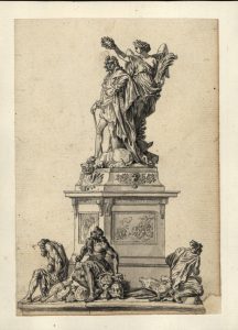 Statue de souverain couronné par la Renommée avec allégorie de peuples vaincus à la base. Plume et encre noire, lavis gris. 16 x 10,8 cm.