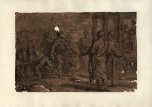 Procession avec un souverain arrivant devant un temple où est une statue féminine. Pierre noire, craie blanche, plume et encre brune, lavis brun, estompe sur papier brun (mauvais état). 21,7 x 33 cm.